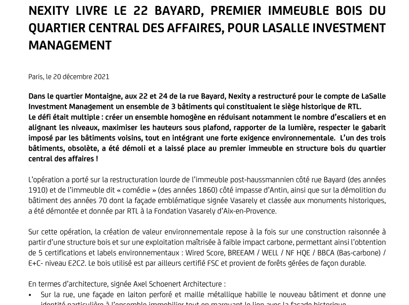 NEXITY LIVRE LE 22 BAYARD, PREMIER IMMEUBLE BOIS DU QUARTIER CENTRAL DES AFFAIRES, POUR LASALLE INVESTMENT MANAGEMENT