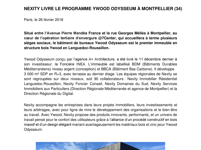 Nexity accompagne les entreprises dans leurs projets immobiliers, leurs investissements et leurs arbitrages, avec pour ligne de mire le développement des organisations et le bien-être au travail. Avec Ywood, Nexity propose des produits innovants, performants, et un univers de travail pensé pour le confort des utilisateurs grâce à l’alliance d’un procédé constructif en bois massif et d’un design élégant mariant avantageusement les matériaux bois et zinc pour Ywood Odysseum.
