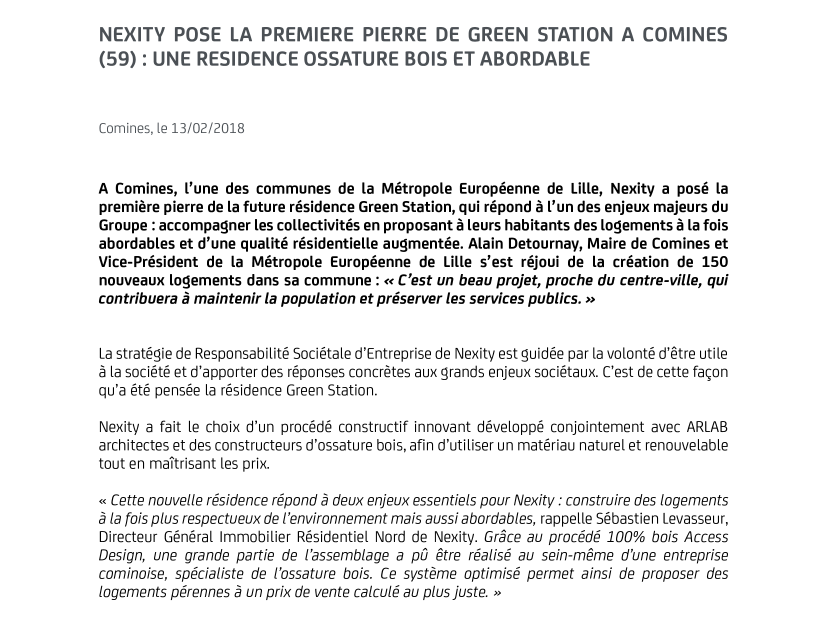 « Cette nouvelle résidence répond à deux enjeux essentiels pour Nexity : construire des logements à la fois plus respectueux de l’environnement mais aussi abordables, rappelle Sébastien Levasseur, Directeur Général Immobilier Résidentiel Nord de Nexity. Grâce au procédé 100% bois Access Design, une grande partie de l’assemblage a pû être réalisé au sein-même d’une entreprise cominoise, spécialiste de l’ossature bois. Ce système optimisé permet ainsi de proposer des logements pérennes à un prix de vente calculé au plus juste. »
