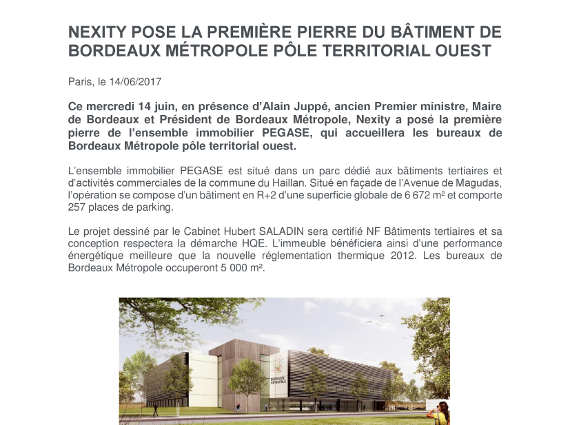 Ce mercredi 14 juin, en présence d’Alain Juppé, ancien Premier ministre, Maire de Bordeaux et Président de Bordeaux Métropole, Nexity a posé la première pierre de l’ensemble immobilier PEGASE, qui accueillera les bureaux de Bordeaux Métropole pôle territorial ouest.