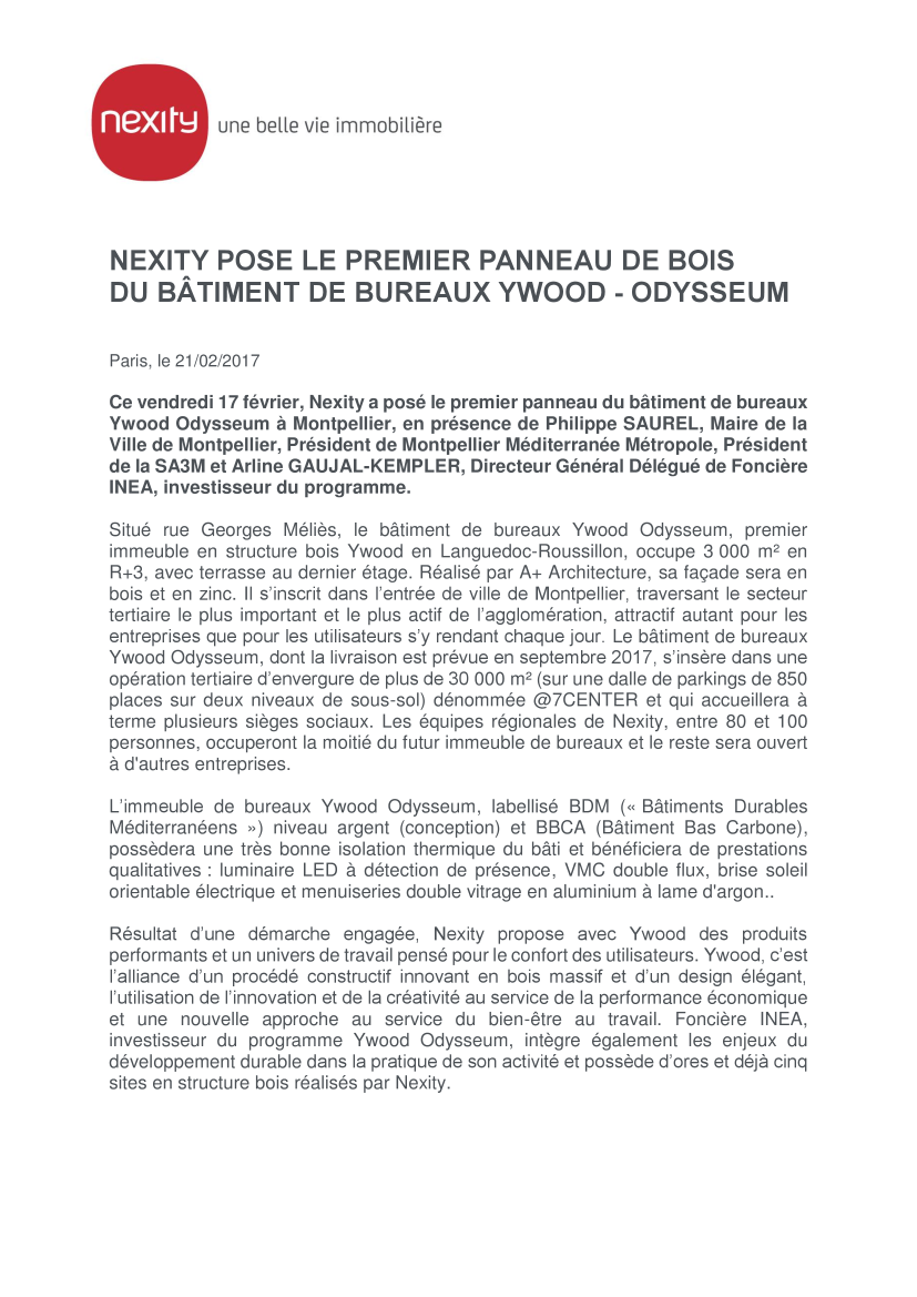 Situé rue Georges Méliès, le bâtiment de bureaux Ywood Odysseum, premier immeuble en structure bois Ywood en Languedoc-Roussillon, occupe 3 000 m² en R+3, avec terrasse au dernier étage. Réalisé par A+ Architecture, sa façade sera en bois et en zinc. Il s’inscrit dans l’entrée de ville de Montpellier, traversant le secteur tertiaire le plus important et le plus actif de l’agglomération, attractif autant pour les entreprises que pour les utilisateurs s’y rendant chaque jour. Le bâtiment de bureaux Ywood Odysseum, dont la livraison est prévue en septembre 2017, s’insère dans une opération tertiaire d’envergure de plus de 30 000 m² (sur une dalle de parkings de 850 places sur deux niveaux de sous-sol) dénommée @7CENTER et qui accueillera à terme plusieurs sièges sociaux. Les équipes régionales de Nexity, entre 80 et 100 personnes, occuperont la moitié du futur immeuble de bureaux et le reste sera ouvert à d'autres entreprises.