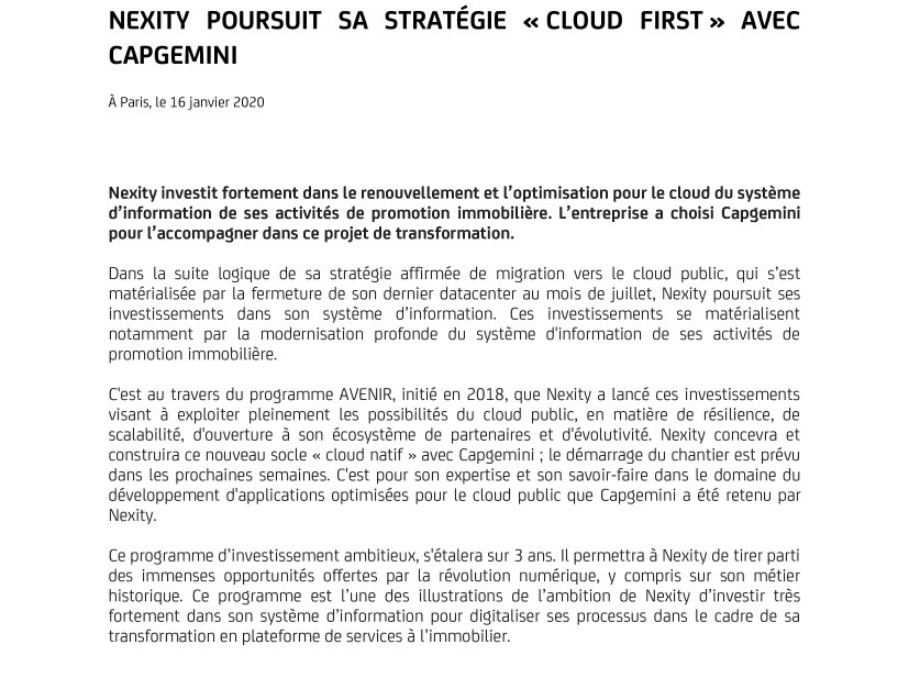 NEXITY POURSUIT SA STRATÉGIE « CLOUD FIRST » AVEC CAPGEMINI