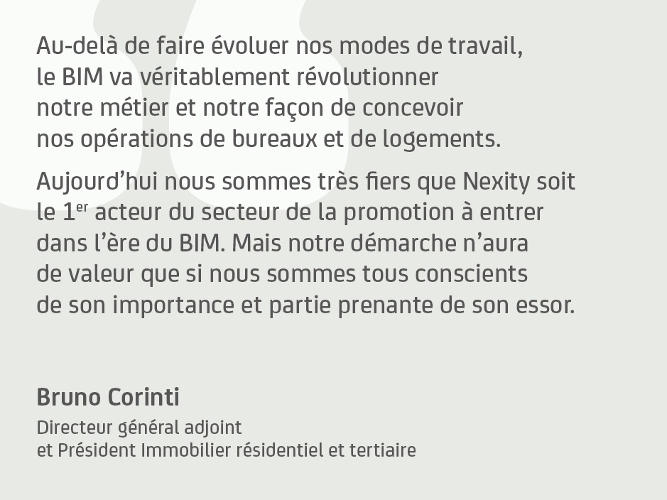 « Au-delà de faire évoluer nos modes de travail, le BIM va véritablement révolutionner notre métier et surtout notre façon de concevoir nos opérations de bureaux et de logements. Aujourd’hui nous sommes très fiers que Nexity soit le 1er acteur du secteur de la promotion à entrer dans l’ère du BIM. Mais notre démarche n’aura de valeur que si nous sommes tous conscients de son importance et partie prenante de son essor », précise Bruno Corinti, Président de l’immobilier résidentiel et tertiaire de Nexity.