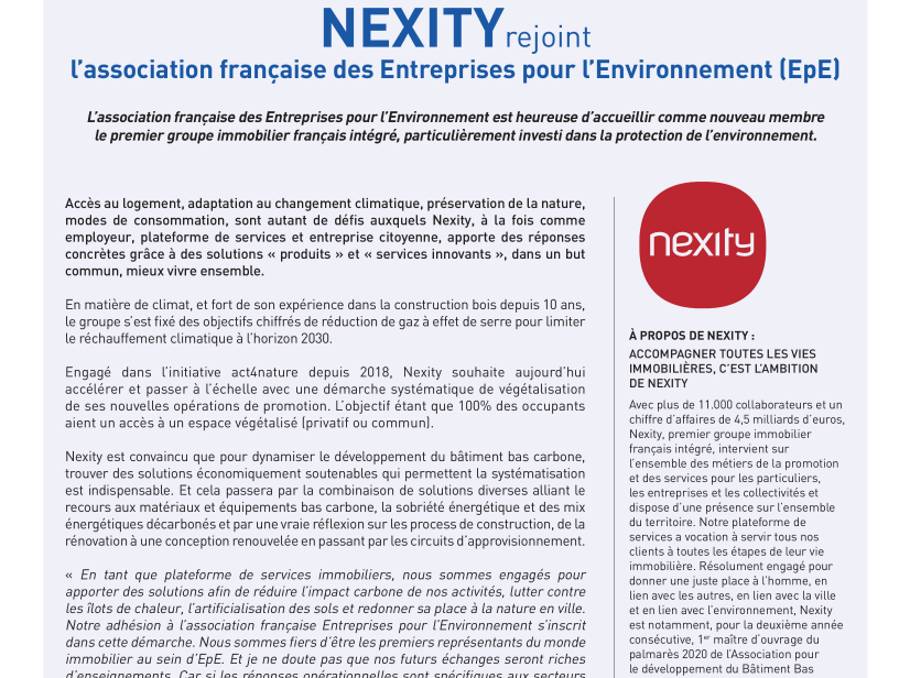 NEXITY REJOINT L’ASSOCIATION FRANÇAISE DES ENTREPRISES POUR L’ENVIRONNEMENT (EPE)