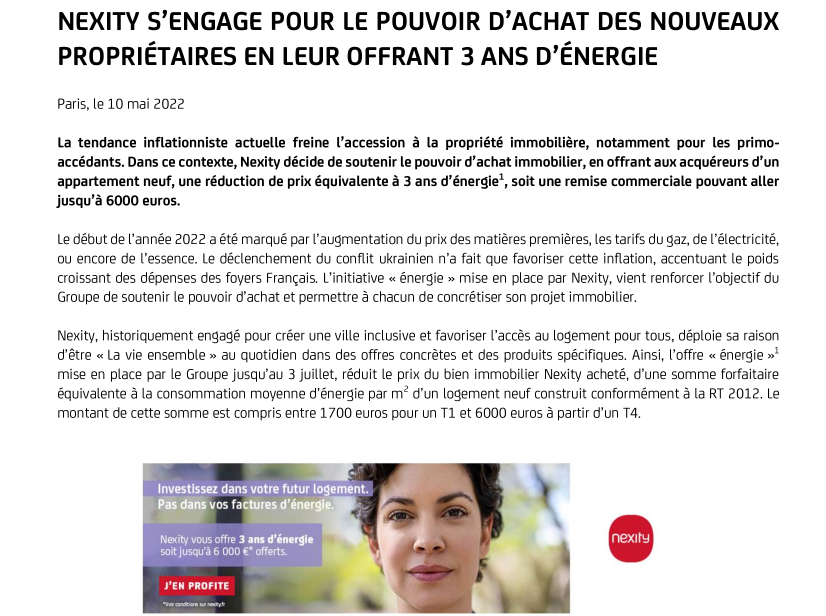 Le début de l’année 2022 a été marqué par l’augmentation du prix des matières premières, les tarifs du gaz, de l’électricité, ou encore de l’essence. Le déclenchement du conflit ukrainien n’a fait que favoriser cette inflation, accentuant le poids croissant des dépenses des foyers Français. L’initiative « énergie » mise en place par Nexity, vient renforcer l’objectif du Groupe de soutenir le pouvoir d’achat et permettre à chacun de concrétiser son projet immobilier.