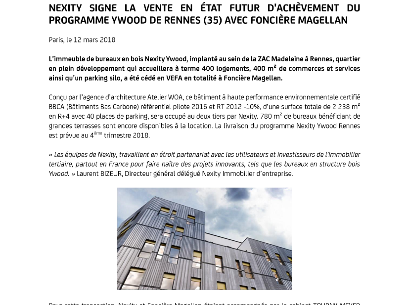 NEXITY SIGNE LA VENTE EN ÉTAT FUTUR D'ACHÈVEMENT DU PROGRAMME YWOOD DE RENNES (35) AVEC FONCIÈRE MAGELLAN