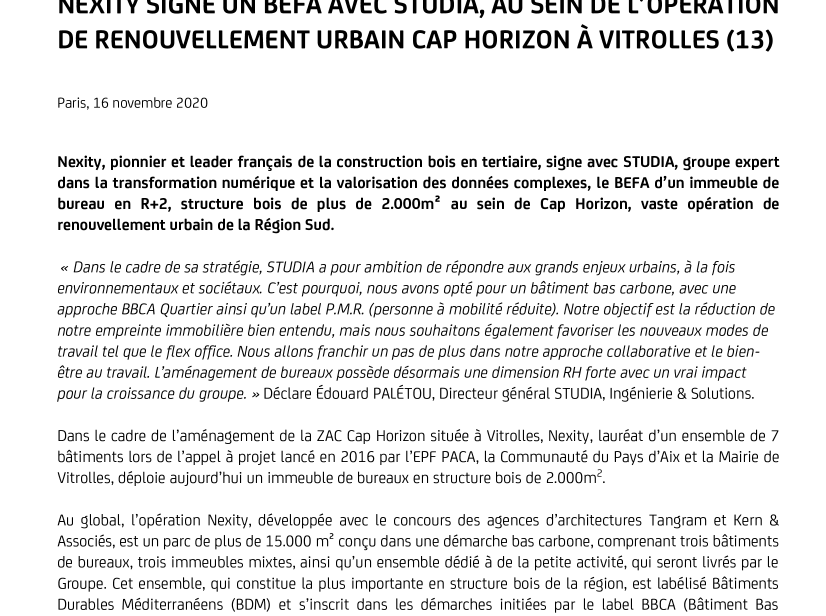 Nexity, pionnier et leader français de la construction bois en tertiaire, signe avec STUDIA, groupe expert dans la transformation numérique et la valorisation des données complexes, le BEFA d’un immeuble de bureau en R+2, structure bois de plus de 2.000m² au sein de Cap Horizon, vaste opération de renouvellement urbain de la Région Sud.