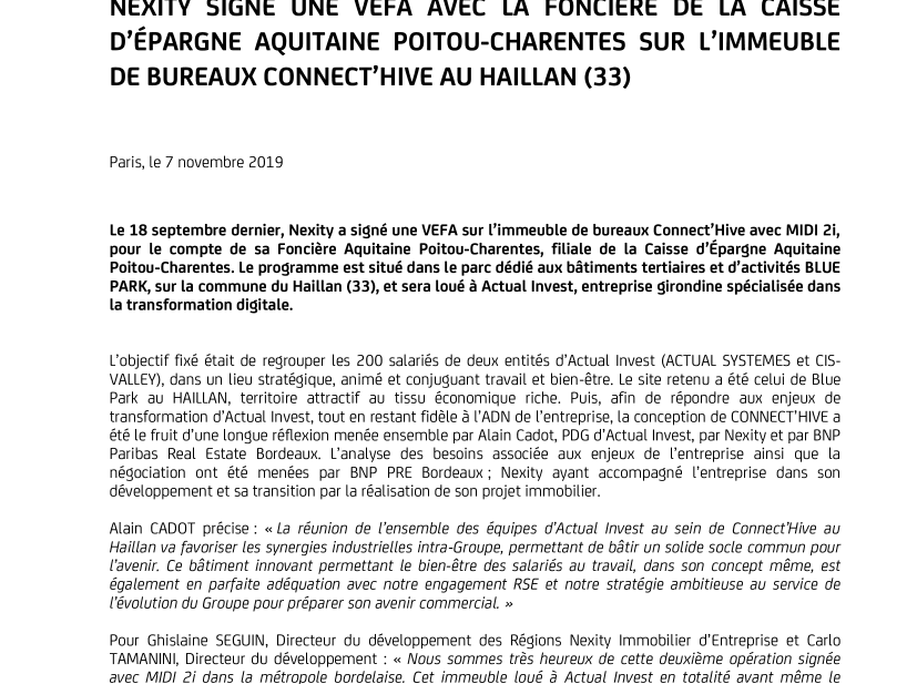 NEXITY SIGNE UNE VEFA AVEC LA FONCIÈRE DE LA CAISSE D’ÉPARGNE AQUITAINE POITOU-CHARENTES SUR L’IMMEUBLE DE BUREAUX CONNECT’HIVE AU HAILLAN (33)