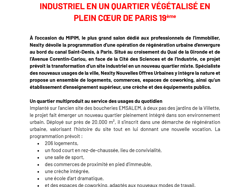 À l’occasion du MIPIM, le plus grand salon dédié aux professionnels de l’immobilier, Nexity dévoile la programmation d’une opération de régénération urbaine d’envergure au bord du canal Saint-Denis, à Paris. Situé au croisement du Quai de la Gironde et de l’Avenue Corentin-Cariou, en face de la Cité des Sciences et de l’Industrie, ce projet prévoit la transformation d’un site industriel en un nouveau quartier mixte. Spécialiste des nouveaux usages de la ville, Nexity Nouvelles Offres Urbaines y intègre la nature et propose un ensemble de logements, commerces, espaces de coworking, ainsi qu’un établissement d’enseignement supérieur, une crèche et des équipements publics.