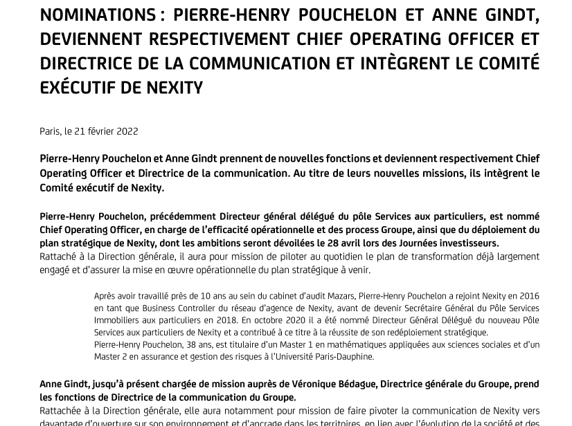 NOMINATIONS : PIERRE-HENRY POUCHELON ET ANNE GINDT DEVIENNENT RESPECTIVEMENT CHIEF OPERATING OFFICER ET DIRECTRICE DE LA COMMUNICATION ET INTÈGRENT LE COMITÉ EXÉCUTIF DE NEXITY