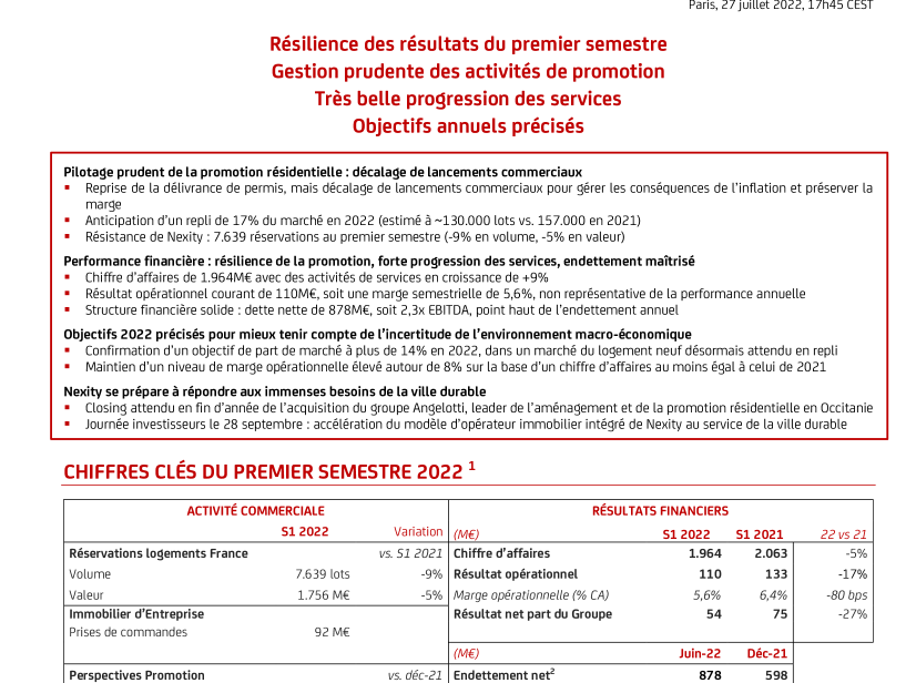 « L’incertitude géopolitique et macroéconomique nous amène à piloter nos opérations avec une prudence renforcée. Pour faire face aux pressions inflationnistes, nous sommes plus sélectifs dans le lancement des opérations et prenons le temps de travailler l’optimisation de nos produits tant sur le coût de revient que sur le prix de vente. Enfin nous capitalisons, une fois le lancement décidé, sur notre offre diversifiée et sur notre force de commercialisation multicanal, qui nous assurent un écoulement optimal. C’est ainsi que nous préservons nos marges et maîtrisons notre endettement. Cette maîtrise de notre offre commerciale nous permet de nous adapter aux évolutions de la demande, qui reste toujours présente, tant de la part des particuliers que des institutionnels, malgré les mesures macro-prudentielles visant à réduire l’offre de crédit aux particuliers et la remontée des taux d’intérêt. Nexity affiche des résultats démontrant la solidité de son modèle, capitalisant en particulier sur sa position de premier promoteur immobilier français et sur la très forte progression des résultats de ses activités de services. Le volume de notre potentiel d’activité, la sécurisation de notre backlog, la solidité de notre bilan et l’implication et la qualité de nos équipes nous rendent confiants pour traverser au mieux cette période d’incertitude et être en capacité de répondre aux immenses besoins en logement des Français. Nous venons d’ailleurs de renforcer nos positions en Occitanie avec la prise de participation majoritaire dans l’entreprise Angelotti, et restons en mouvement pour participer à la consolidation à venir du secteur et mieux répondre aux enjeux de la ville durable.»