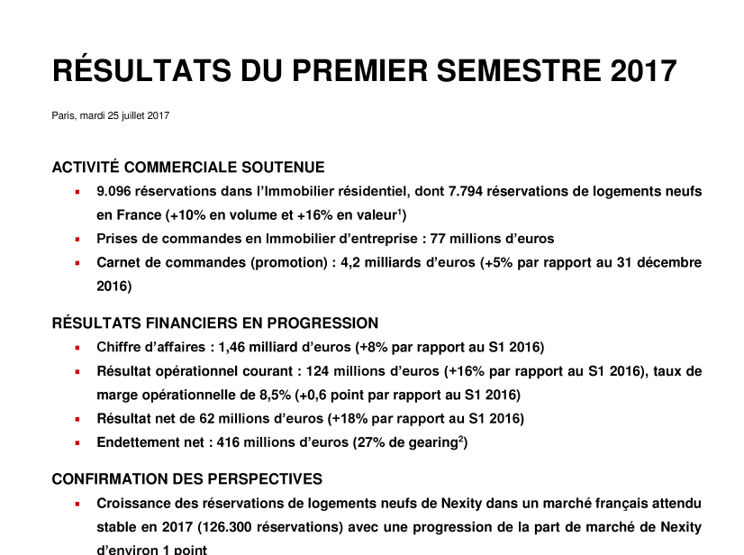 Au point de vue financier, Nexity voit son chiffre d’affaires progresser de 8% et son résultat opérationnel courant de 16% par rapport au 1er semestre 2016. Tous les métiers affichent de belles performances, et les métiers de services poursuivent leur trajectoire d’amélioration. Nous confirmons l’ensemble des objectifs donnés au marché en début d’année. Et l’entreprise dans son ensemble poursuit sa transformation en plateforme de Services dans une organisation résolument tournée vers les préoccupations et attentes de ses clients.