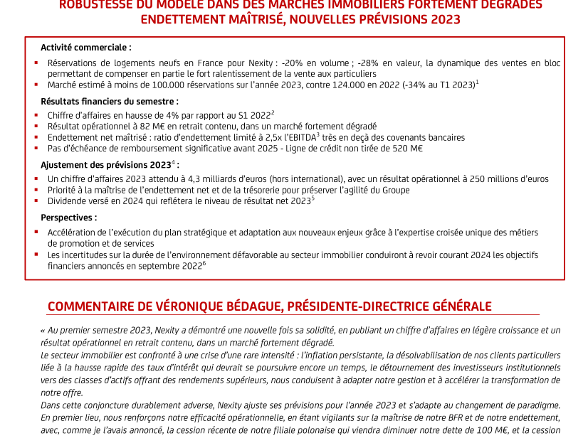 « Au premier semestre 2023, Nexity a démontré une nouvelle fois sa solidité, en publiant un chiffre d’affaires en légère croissance et un résultat opérationnel en retrait contenu, dans un marché fortement dégradé.