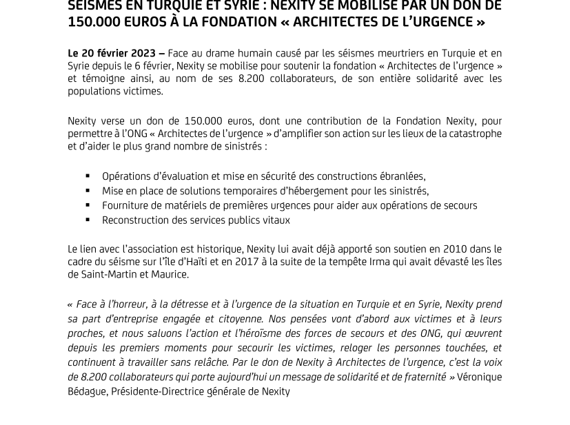 « Face à l’horreur, à la détresse et à l’urgence de la situation en Turquie et en Syrie, Nexity prend sa part d’entreprise engagée et citoyenne. Nos pensées vont d’abord aux victimes et à leurs proches, et nous saluons l’action et l’héroïsme des forces de secours et des ONG, qui œuvrent depuis les premiers moments pour secourir les victimes, reloger les personnes touchées, et continuent à travailler sans relâche. Par le don de Nexity à Architectes de l’urgence, c’est la voix de 8.200 collaborateurs qui porte aujourd’hui un message de solidarité et de fraternité » Véronique Bédague, Présidente-Directrice générale de Nexity