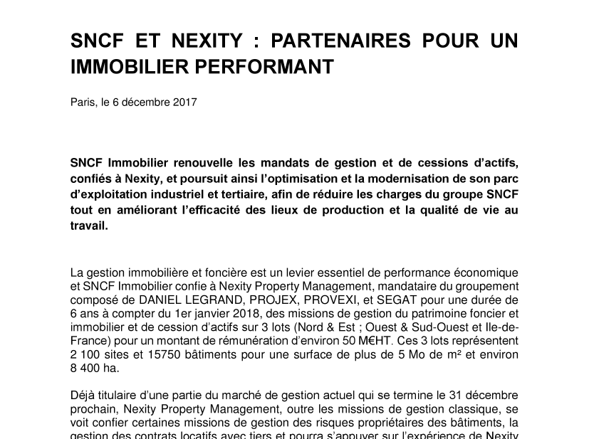La gestion immobilière et foncière est un levier essentiel de performance économique et SNCF Immobilier confie à Nexity Property Management, mandataire du groupement composé de DANIEL LEGRAND, PROJEX, PROVEXI, et SEGAT pour une durée de 6 ans à compter du 1er janvier 2018, des missions de gestion du patrimoine foncier et immobilier et de cession d’actifs sur 3 lots (Nord & Est ; Ouest & Sud-Ouest et Ile-de-France) pour un montant de rémunération d’environ 50 M€HT. Ces 3 lots représentent 2 100 sites et 15750 bâtiments pour une surface de plus de 5 Mo de m² et environ 8 400 ha.