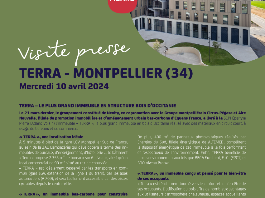 Mercredi 10 avril 2024, s'est déroulée la visite presse de l'opération "TERRA" à Montpellier, le plus grand immeuble en bois d'Occitanie réalisé avec des matériaux en circuit court, à usage de bureaux et de commerce. Le 21 mars 2024, le groupement constitué de Nexity, copromotion avec le Groupe montpelliérain Cirrus-Pégase et Aire Nouvelle, filiale de promotion immobilière et d'aménagement urbain bas-carbone d'Equans France, a livré à la SCPI Epargne Pierre (Atland Voisin) cette opération à ses premiers utilisateurs.