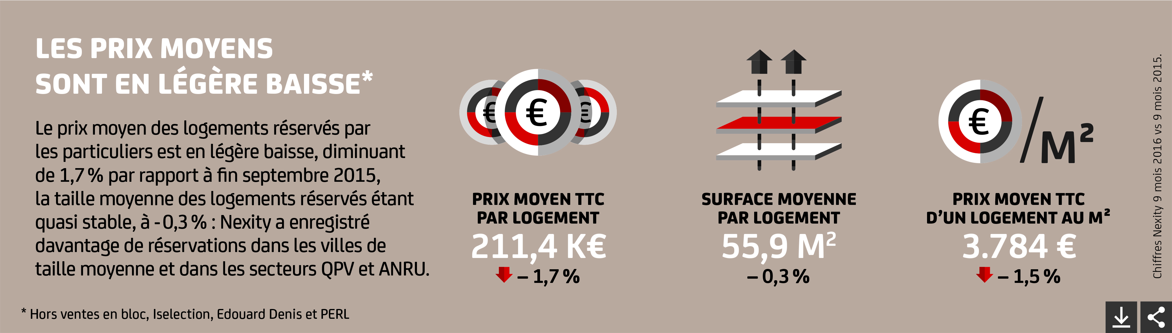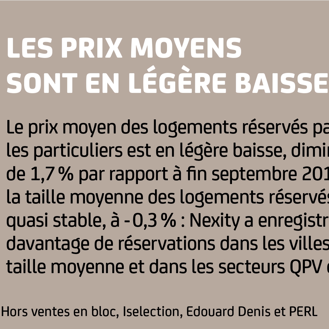 Le prix moyen des logements réservés par les particuliers est en légère baisse, diminuant de 1,7 % par rapport à fi n septembre 2015, la taille moyenne des logements réservés étant quasi stable, à - 0,3 % : Nexity a enregistré
