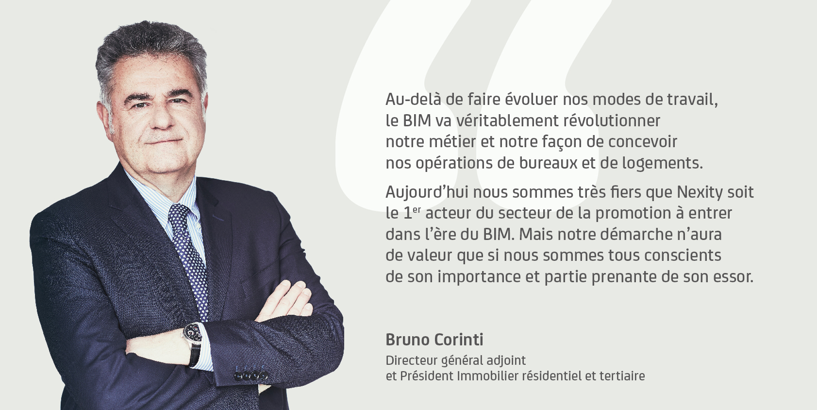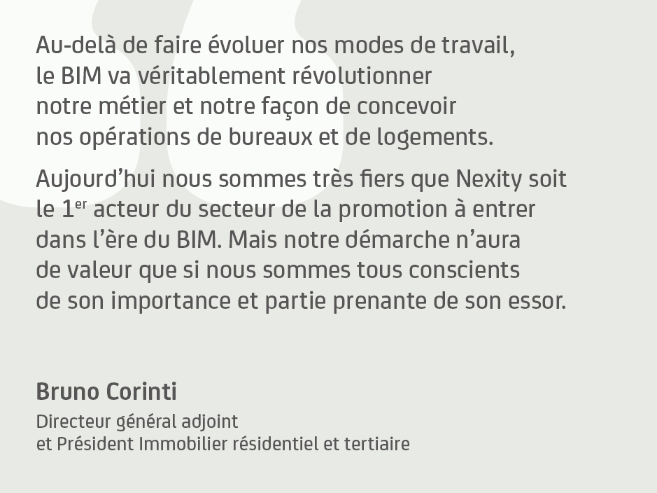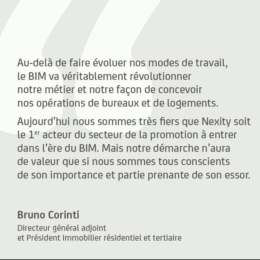 « Au-delà de faire évoluer nos modes de travail, le BIM va véritablement révolutionner notre métier et notre façon de concevoir nos opérations de bureaux et de logements. Aujourd’hui nous sommes très fiers que Nexity soit le 1er acteur du secteur de la promotion à entrer dans l’ère du BIM. Mais notre démarche n’aura de valeur que si nous sommes tous conscients de son importance et partie prenante de son essor »